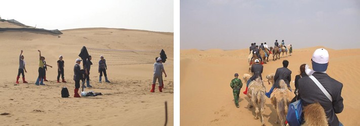 大家懷著激情昂揚(yáng)的心情下了車,進(jìn)行了沙漠排球、滑沙、騎駱駝等各種項(xiàng)目